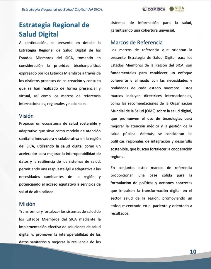 La Estrategia Regional de Salud Digital de los Estados Miembros del SICA es una respuesta a la necesidad de adaptar los sistemas de salud a la era digital2. Esta estrategia es el resultado de un compromiso profundo y colaborativo entre los Estados Miembros, destinado a mejorar la eficiencia, accesibilidad y calidad de los servicios de salud mediante el aprovechamiento de las tecnologías digitales. Al hacerlo, no solo se optimizan los recursos y capacidades existentes, sino que también se fomenta una cooperación transfronteriza esencial, garantizando un enfoque más integrado y equitativo en el manejo de la salud pública.
